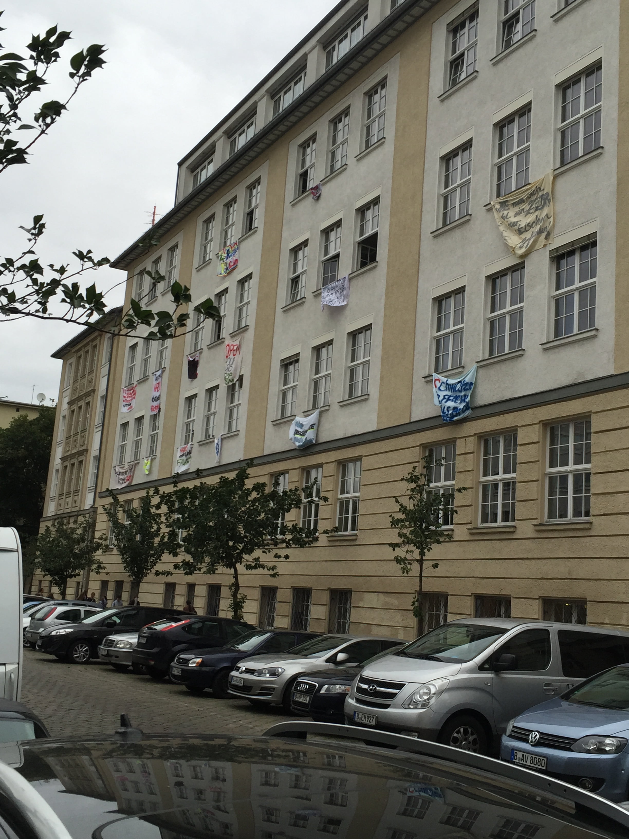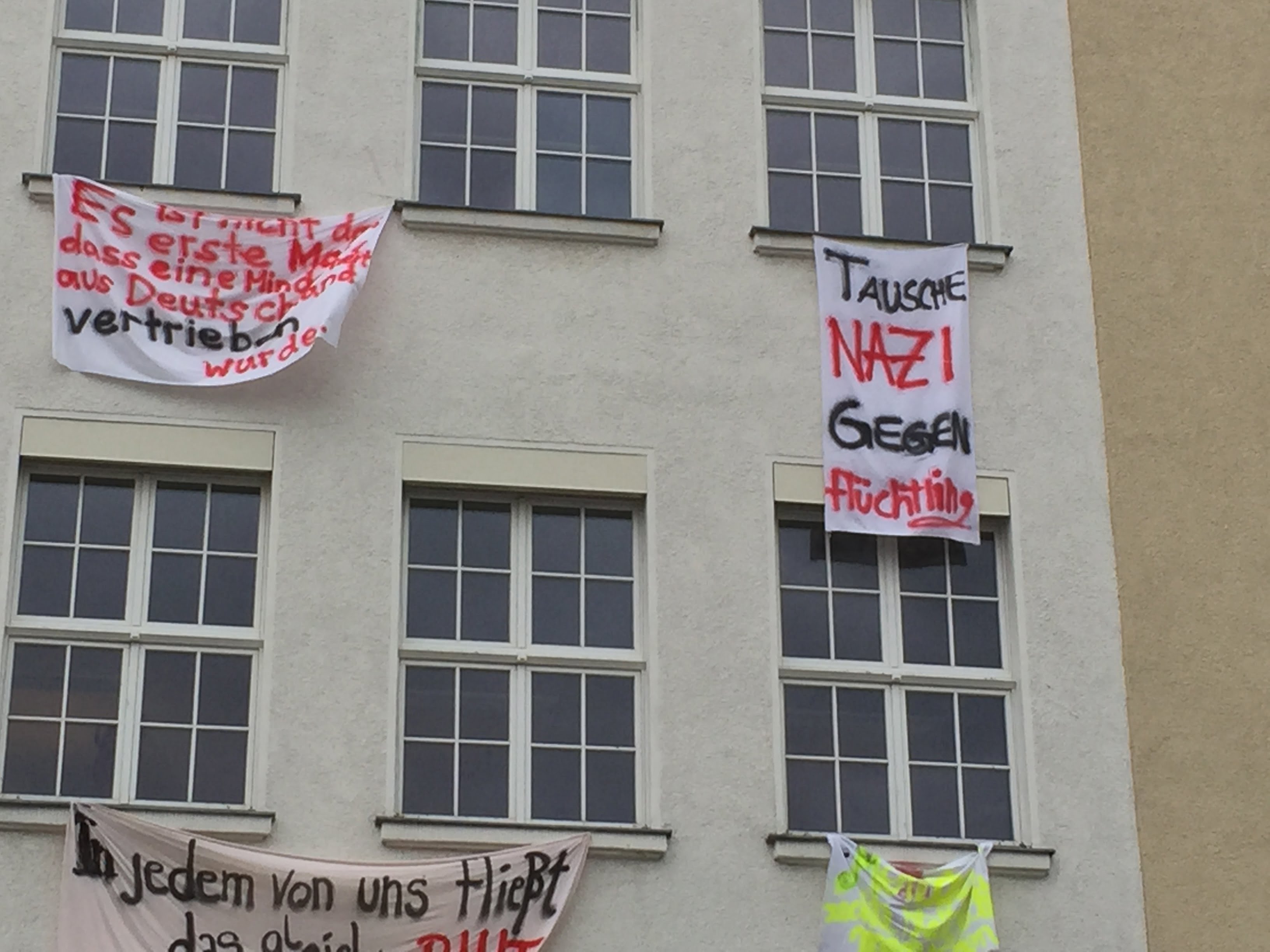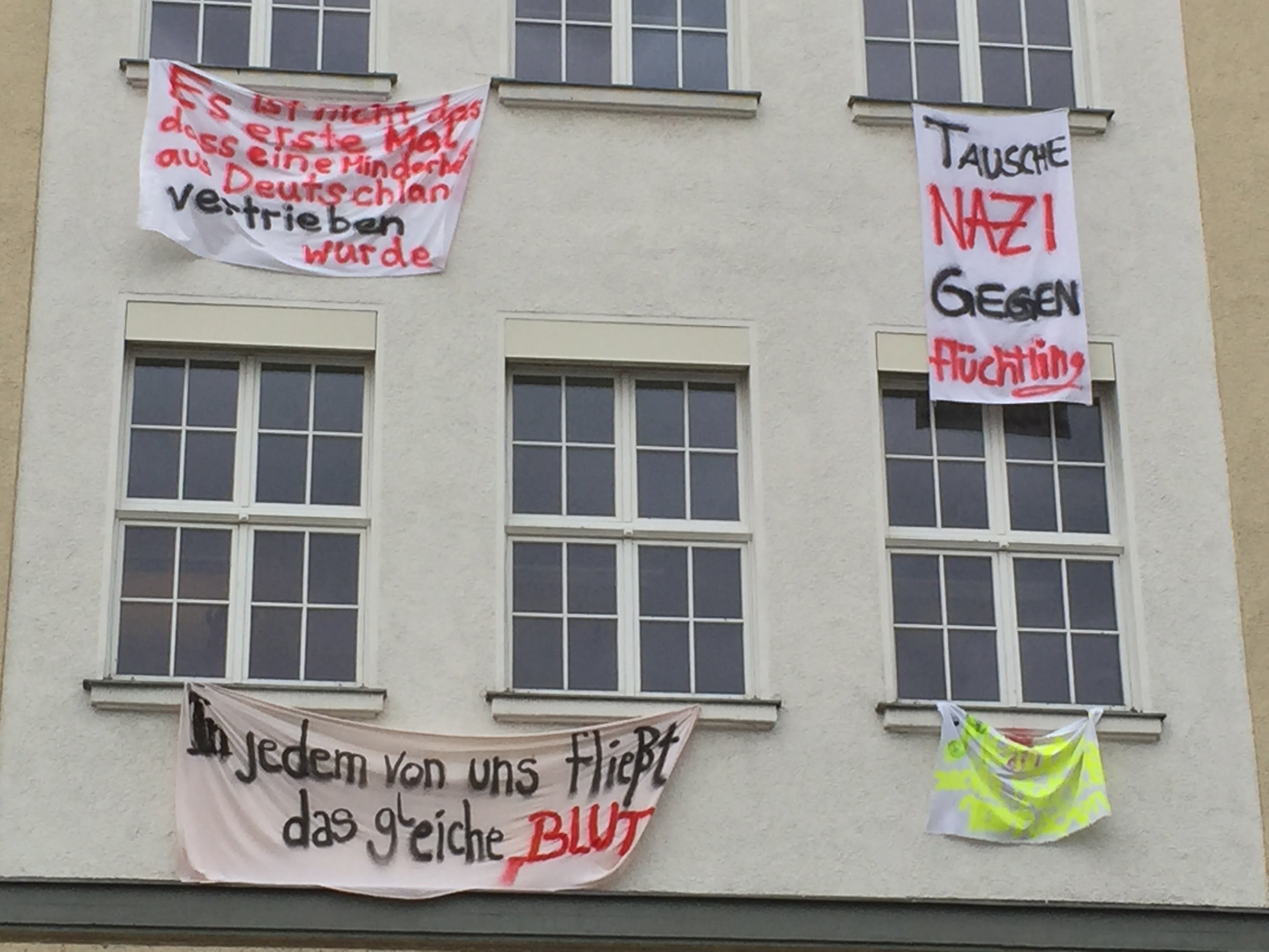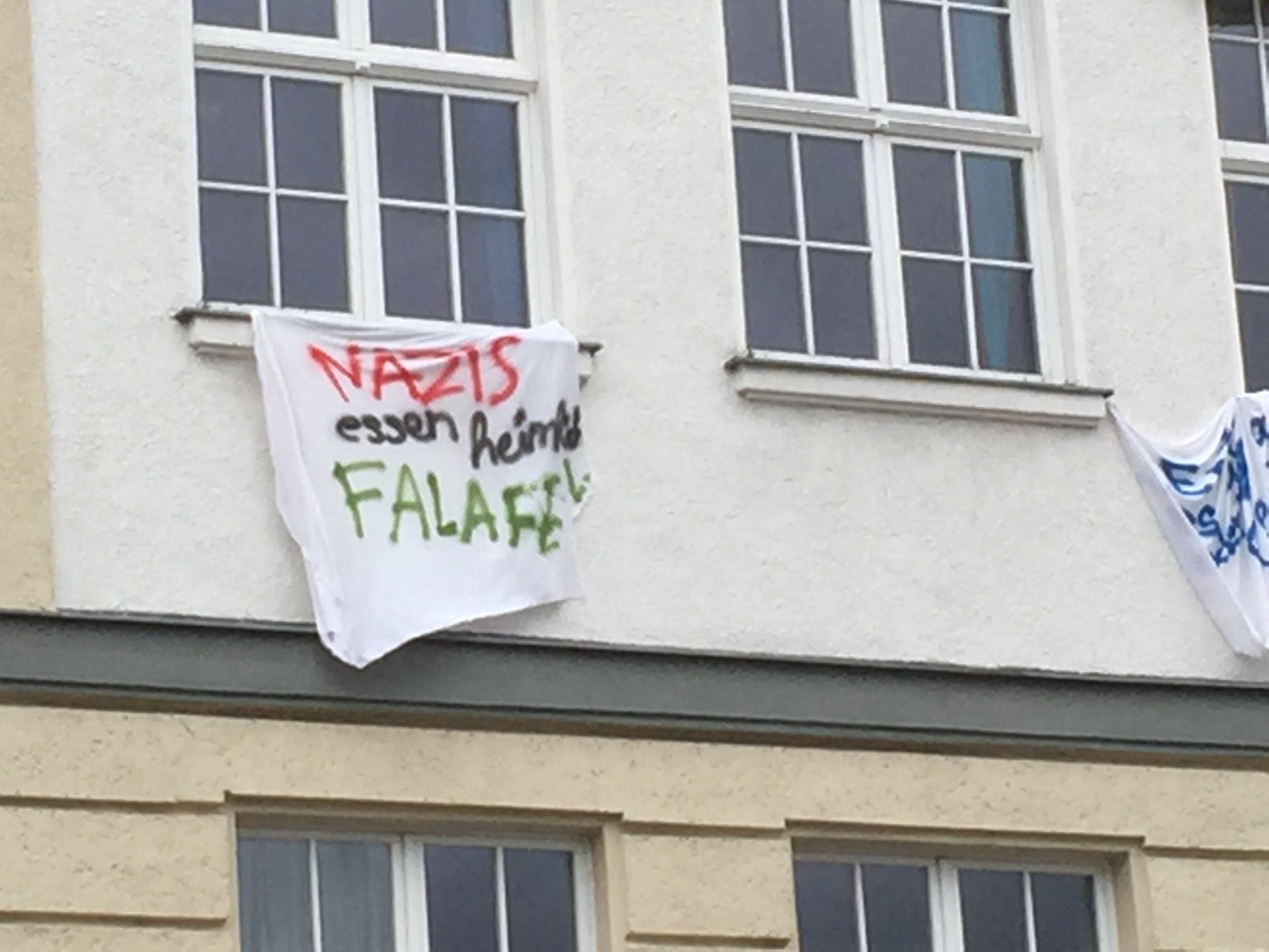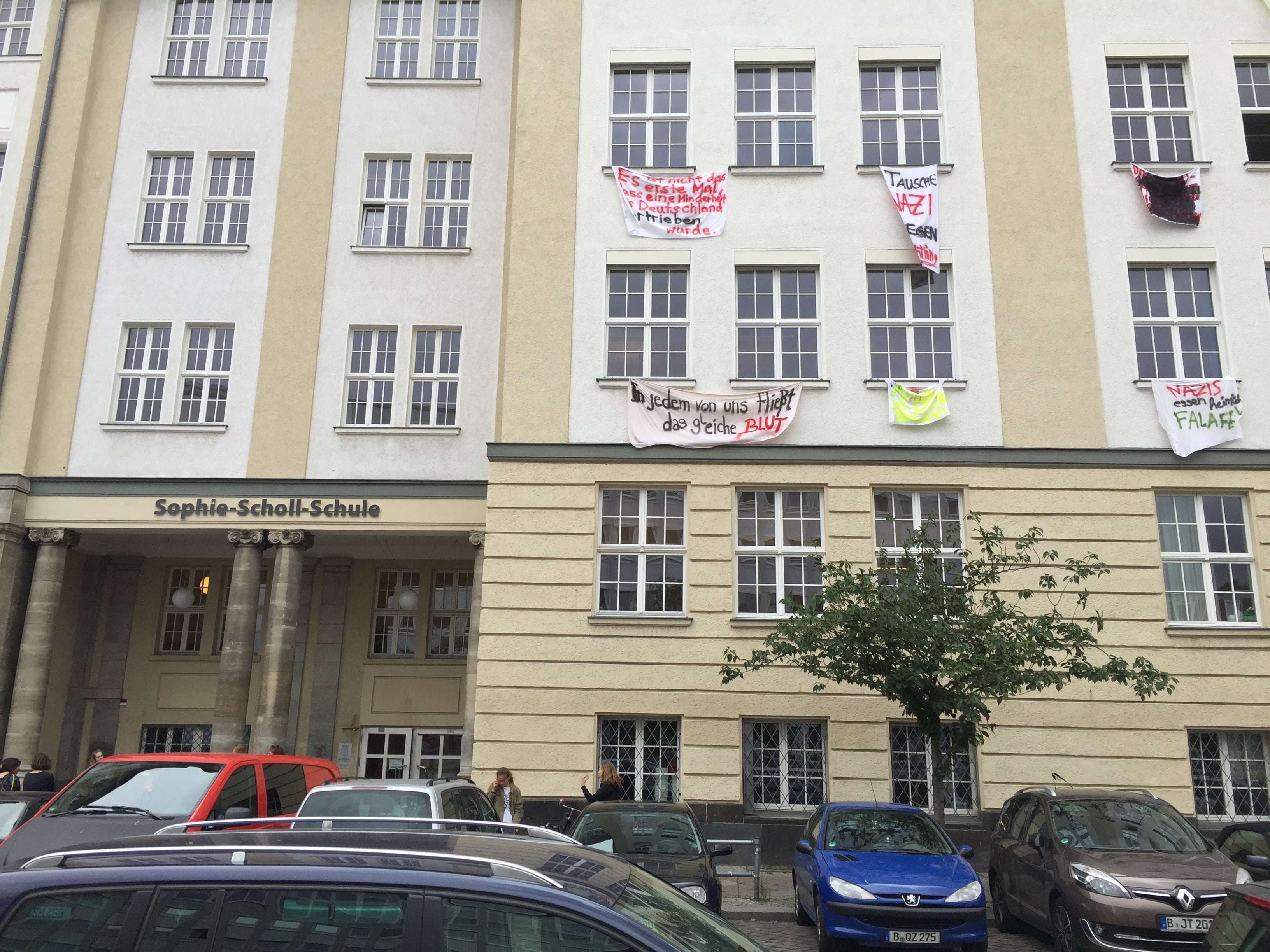 Ein umso seltsameres Gefühl hatte ich, als ich auf meinem Spaziergang nach dem Mittagessen an der nur wenige Kilometer von der betroffenen Paula-Fürst-Schule entfernten Schöneberger Staatlichen Europaschule „Sophie-Scholl-Schule“ vorbeilief – und statt Trauerbekundungen dort die ganze Fassade mit verstörenden Bannern „dekoriert“ war – Bilder, die sich von ganz alleine im gegenwärtigen Kontext kommentieren.