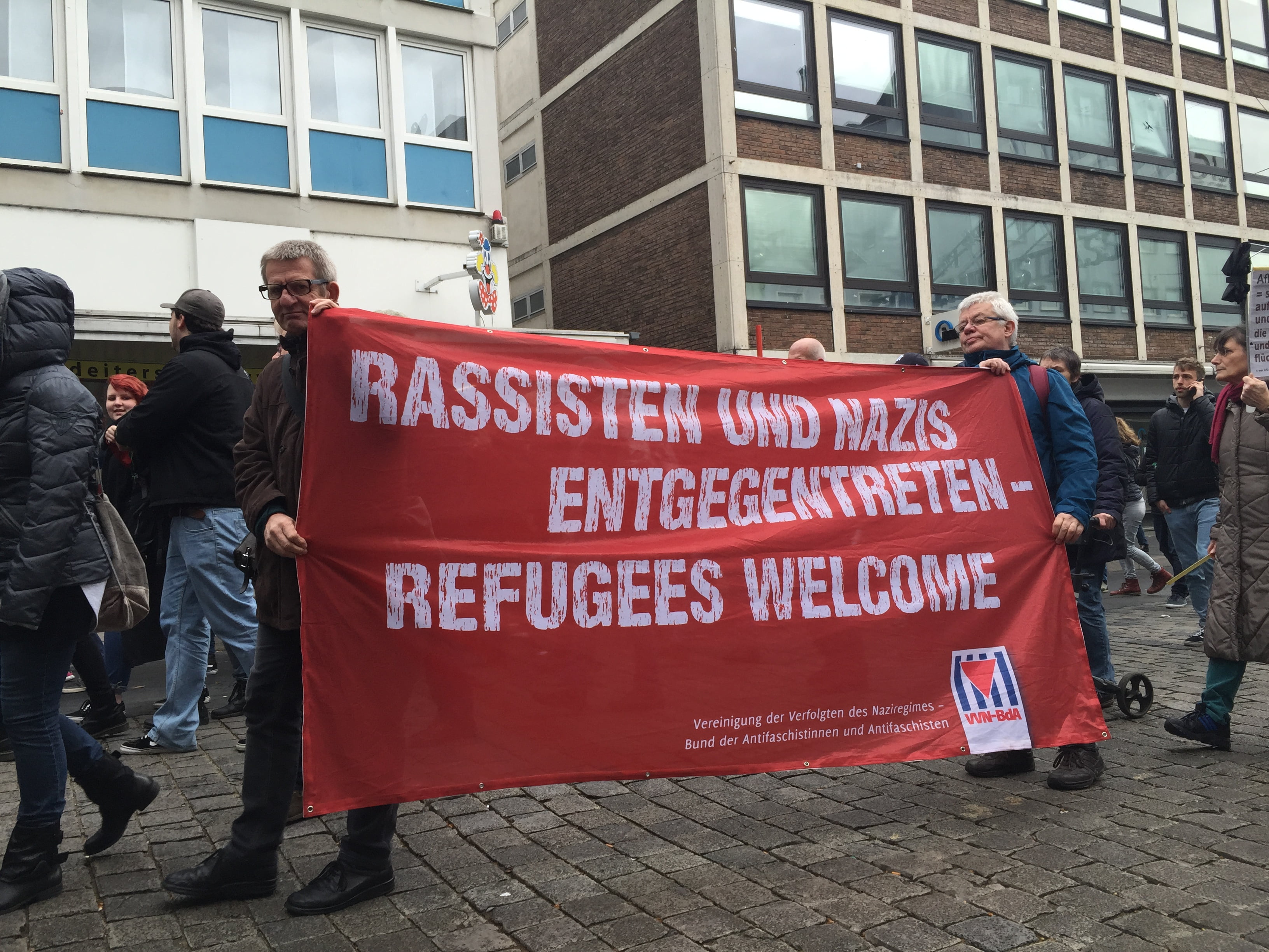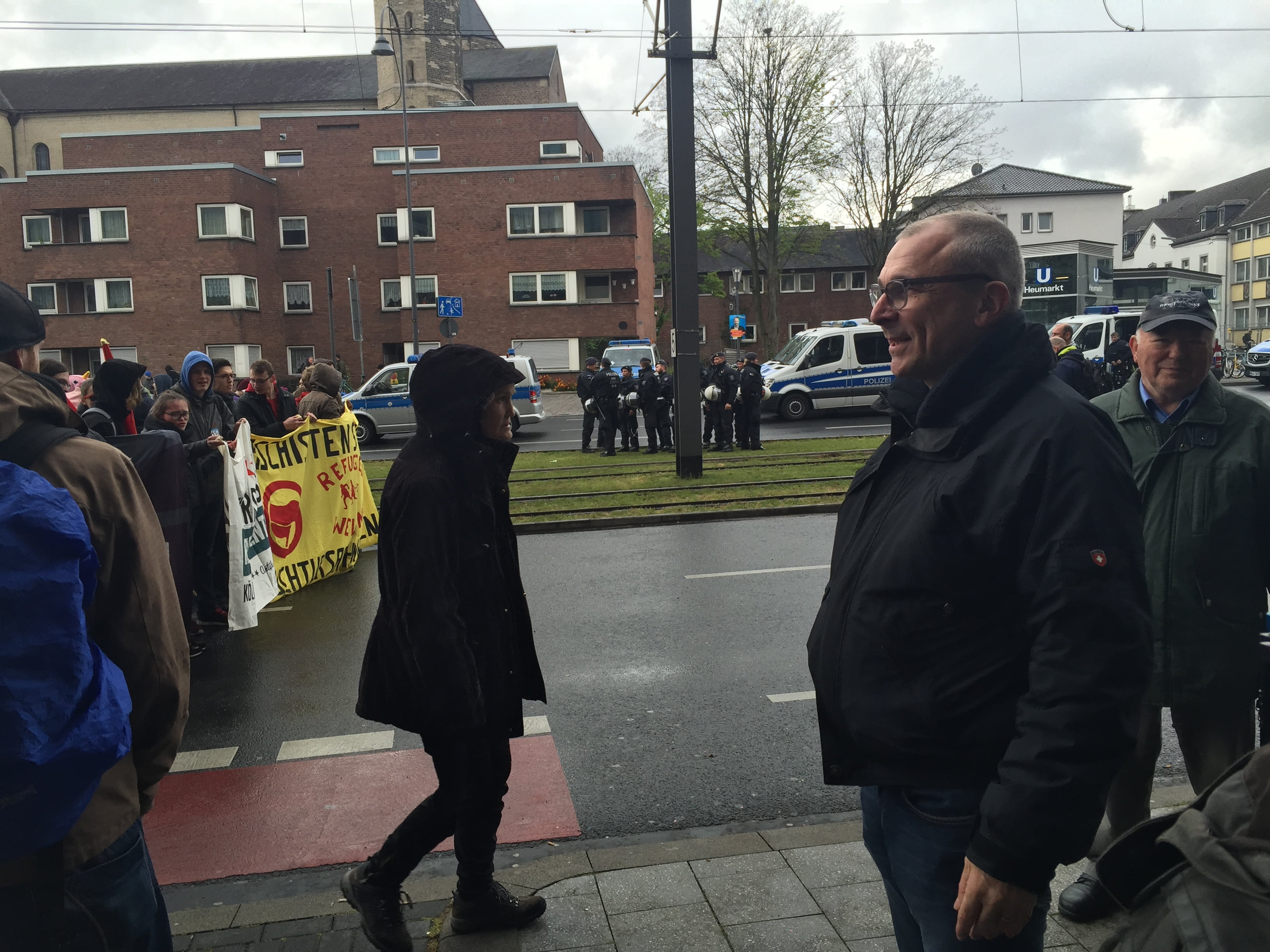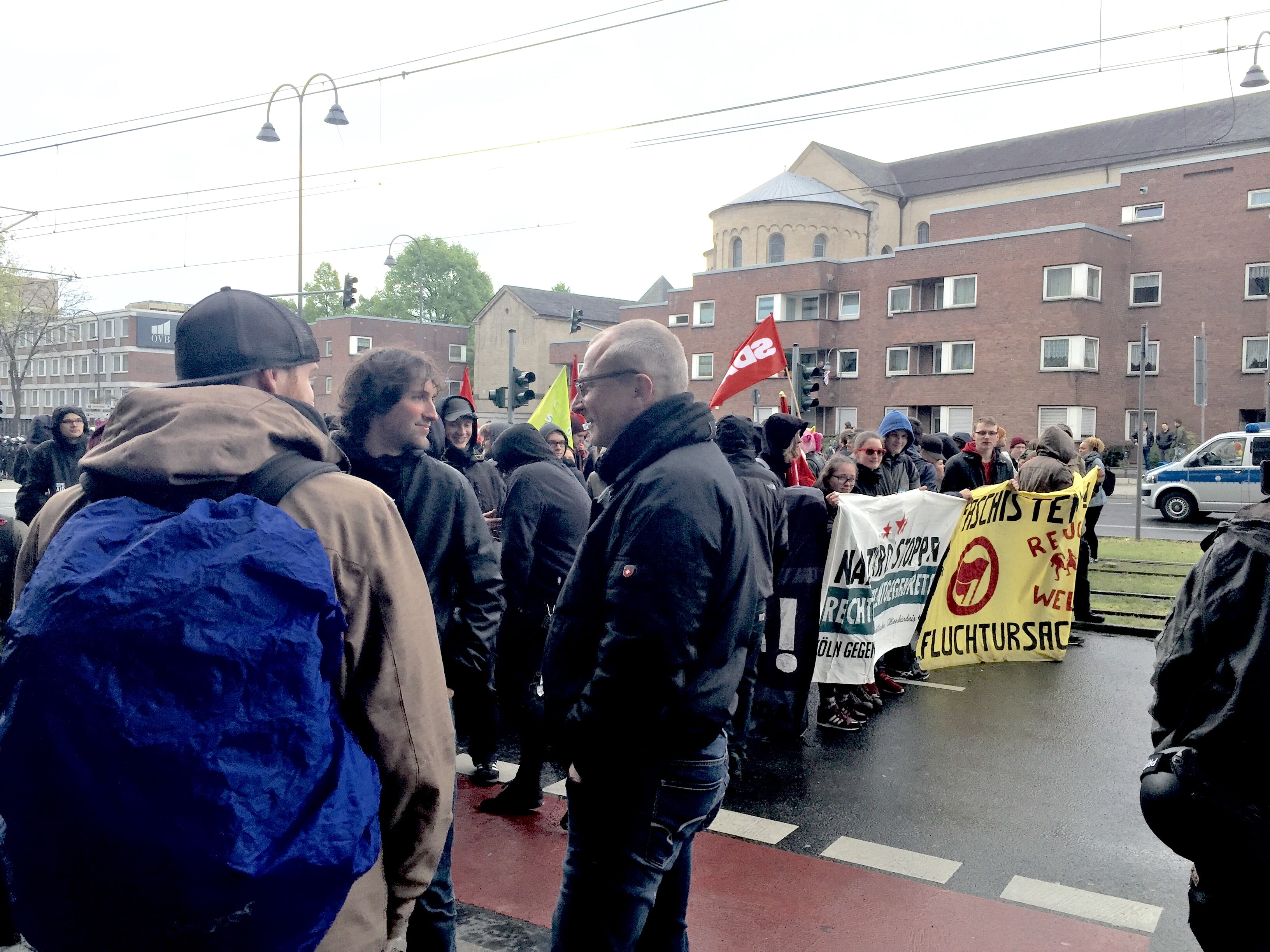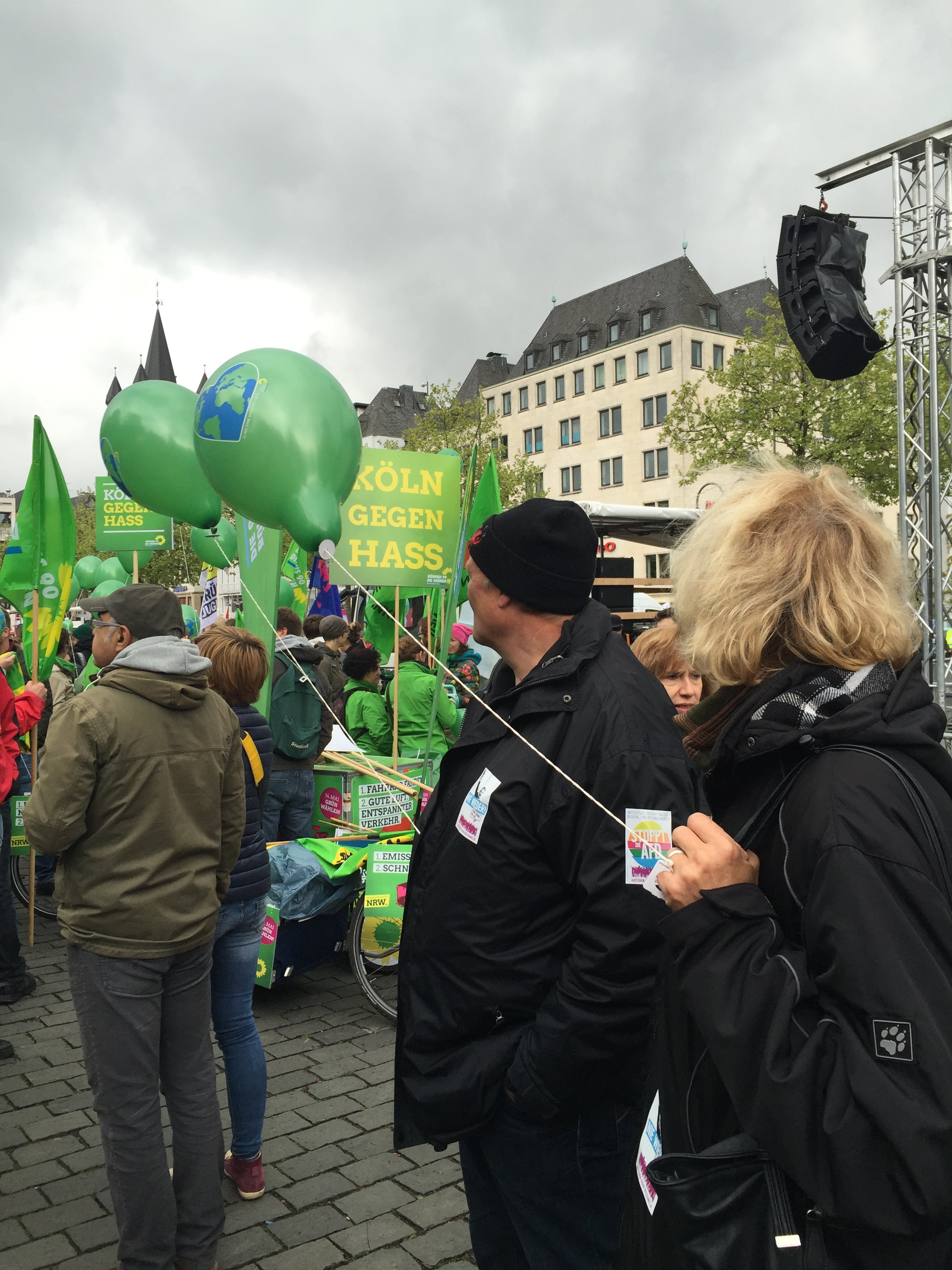 Am Neumarkt dann spricht bei den Grünen, die zuvor mit Bauchtanz und arabischen Klängen gegen die „Nazis“ demonstriert haben, die umstrittene Kölner Oberbürgermeisterin Henriette Reker („Eine Armlänge Abstand“):