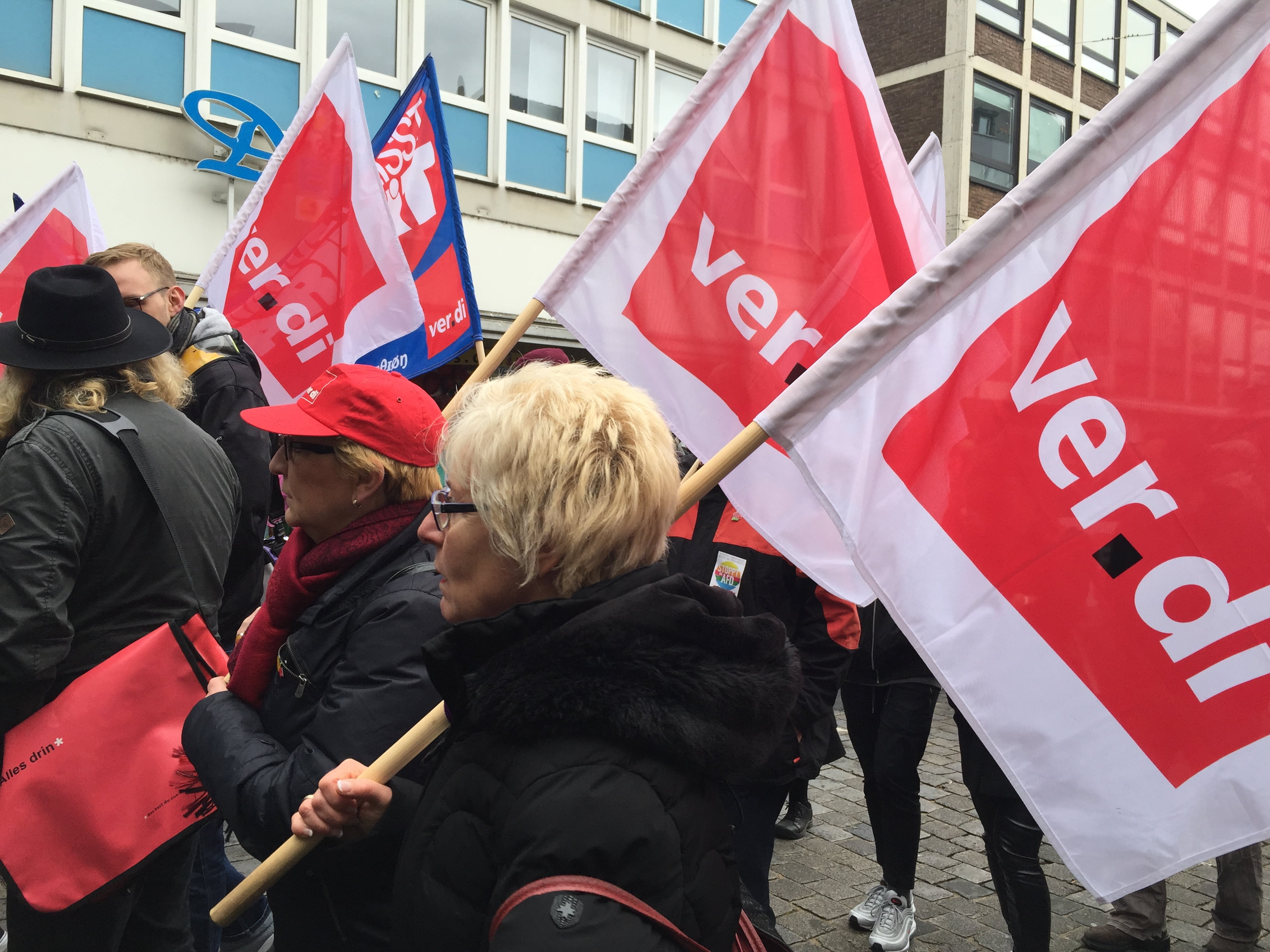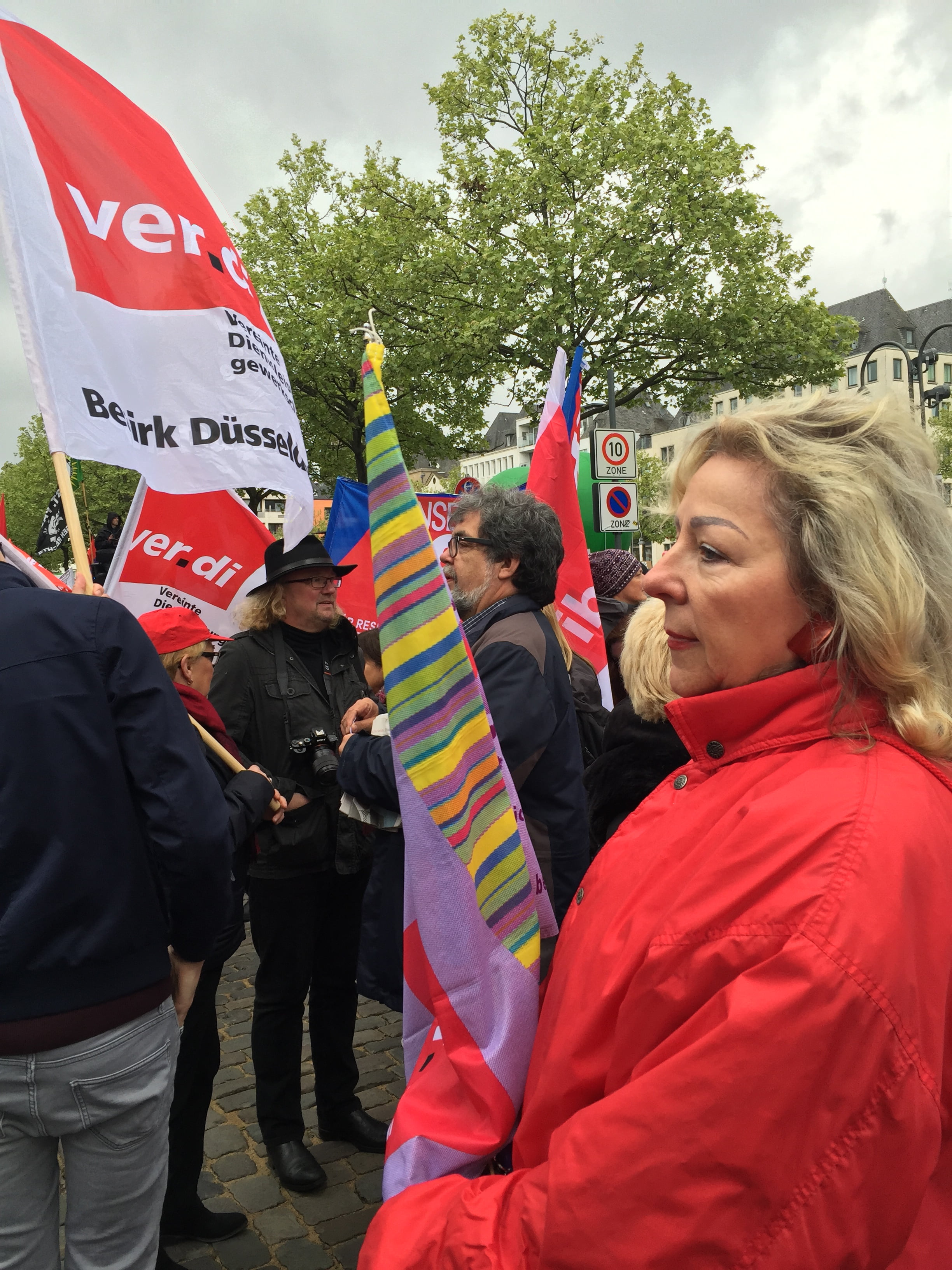 Auf den ersten Blick könnte man denken, sie habe die auf der Demo hörbare Parolen gemeint und Messer mit Steinen verwechselt. Dem ist aber wohl nicht so. Denn sie ergänzt: Sie sei stolz auf diese Stadt ruft sie in die rot-schwarz-grüne Herde, aus der einige Protagonisten bereits „druff“ wirken. Ähnlich sehen das vermutlich die „Medienmenschen gegen rechts“ von ver.di, die ebenfalls an der Demo teilnahmen (Bild oben).