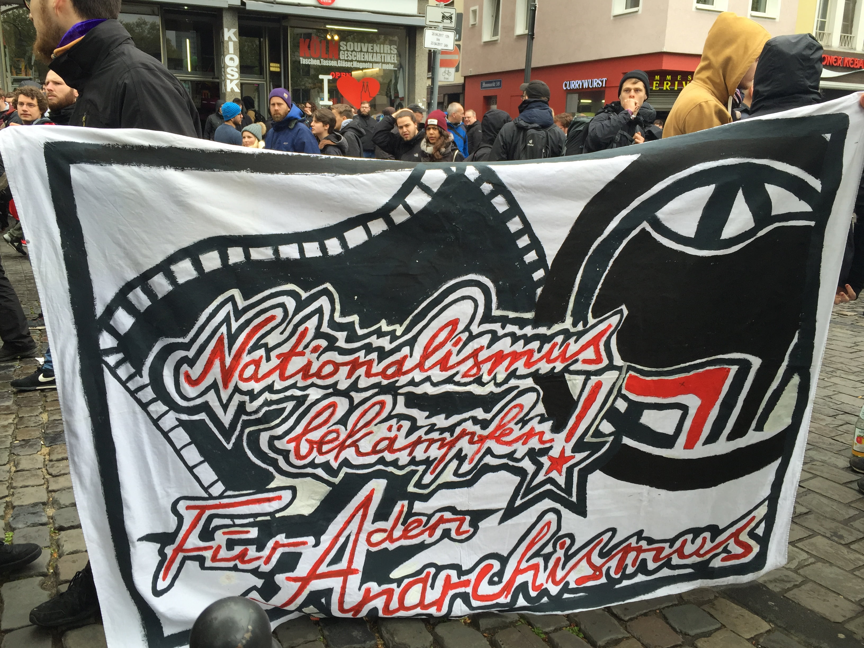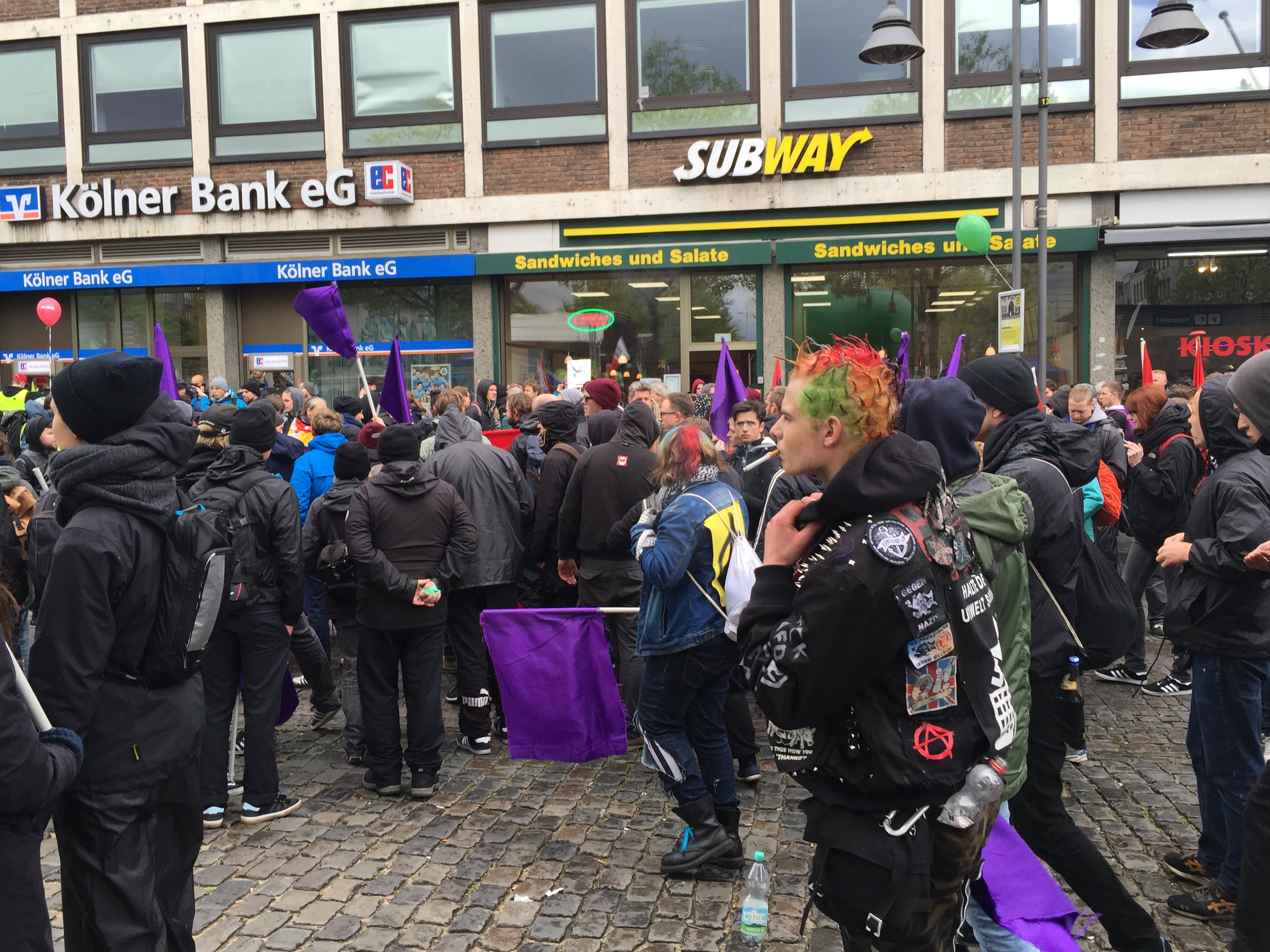 Viele aus dem Block können nur spanisch oder englisch sprechen. Den Parolenvorsagern rufen sie das Vorgesagte nach. Dazwischen erklingt deutsche Musik, die den Leidensweg der Linken besingt und irgendwas von Hitler. Wie und von wem finanziert die Spanier, Italiener und Schweden nach Köln gekommen sind, kann ich nicht herausfinden. Solchen Fragen weicht man aus.