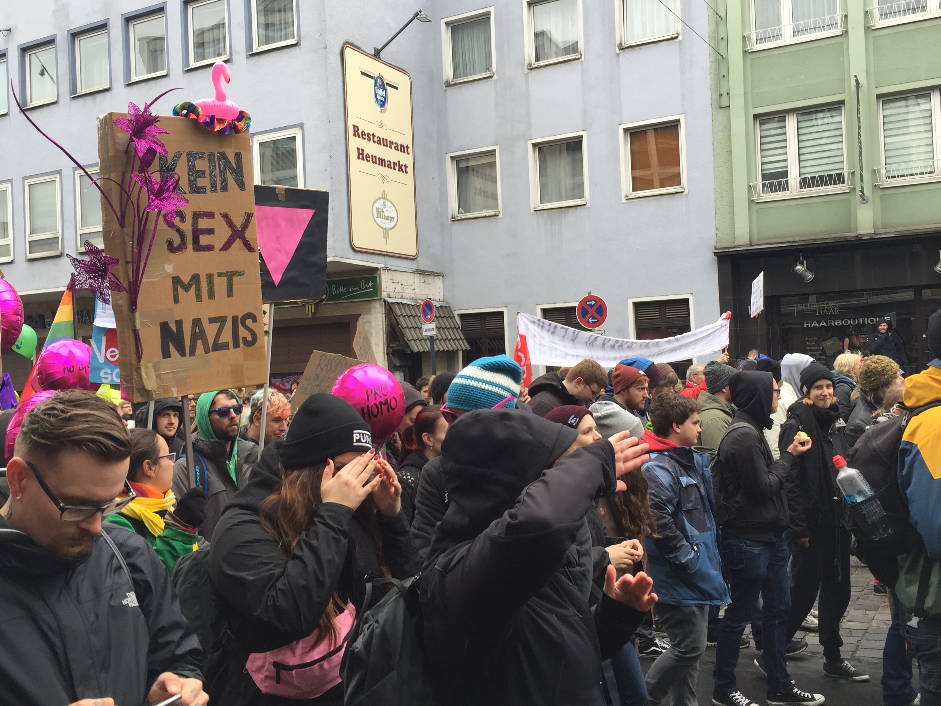 Politisch bewegte Schwule und vor allem auch Lesben zeigen natürlich auch Flagge – groß ist der Unterschied zum Cologne Pride, der letztes Jahr hier stattfand, ohnehin nicht. Und dass sie keinen Sex mit „Nazis“ wollen, glaubt ihnen sowieso keiner …