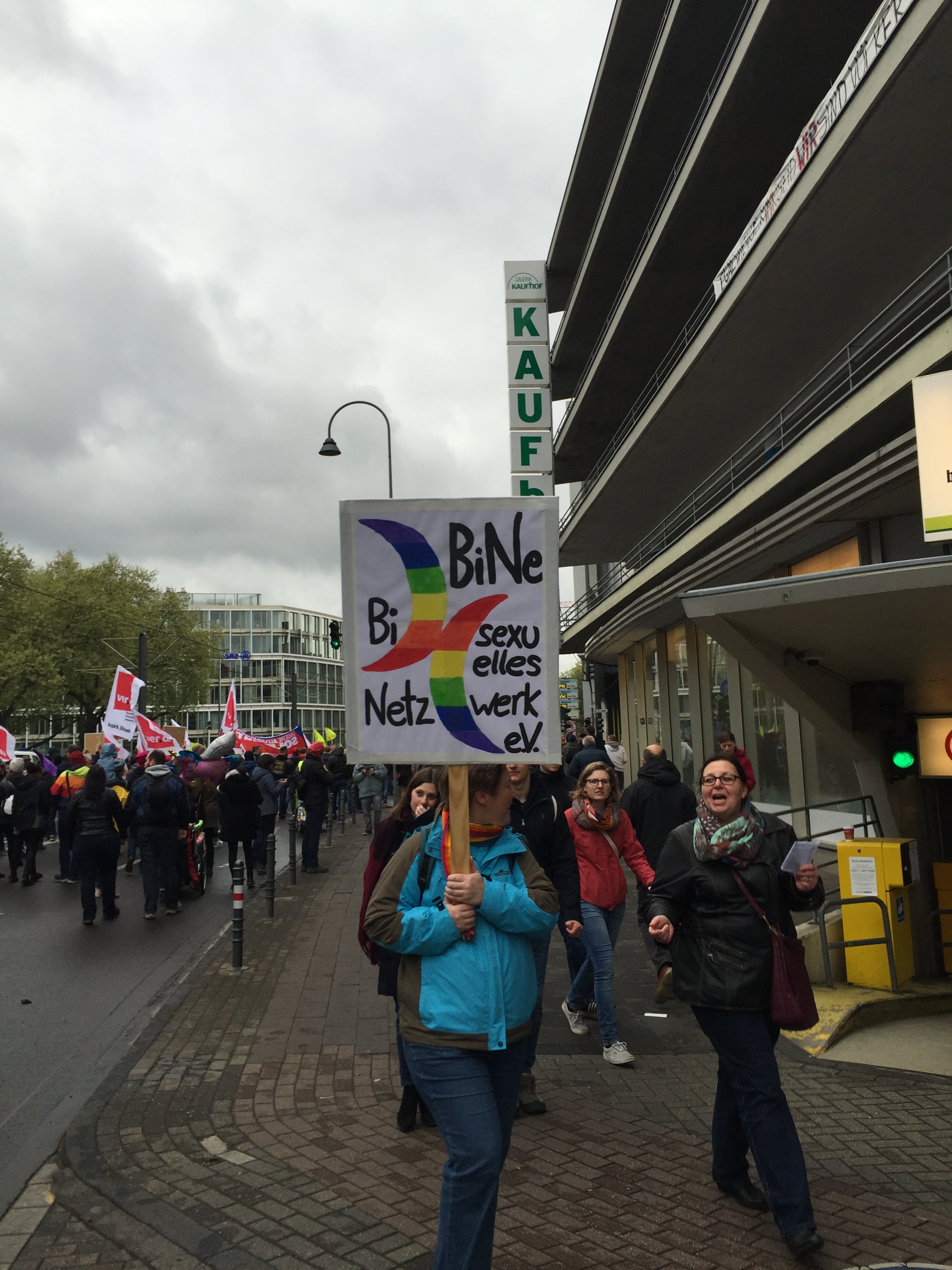 Ein junger Mann will nicht fotografiert werden, er erzählt mir, dass er bei einer Bank in Köln arbeite und Angst vor Repressionen habe. Irgendwie scheine ich dann zu nerven und man riecht den „Rechtspopulisten“ – eine junge Frau komplementiert mich aus der Gruppe heraus und bittet mich freundlich, aber bestimmt hier keine Fotos zu machen oder „Genossen anzusprechen“. Mit mir verlässt ein Demonstrant aus Italien die Demo, stellt sein Schild am Kaufhof ab (Foto rechts) und sagt, er wolle jetzt noch einkaufen gehen.