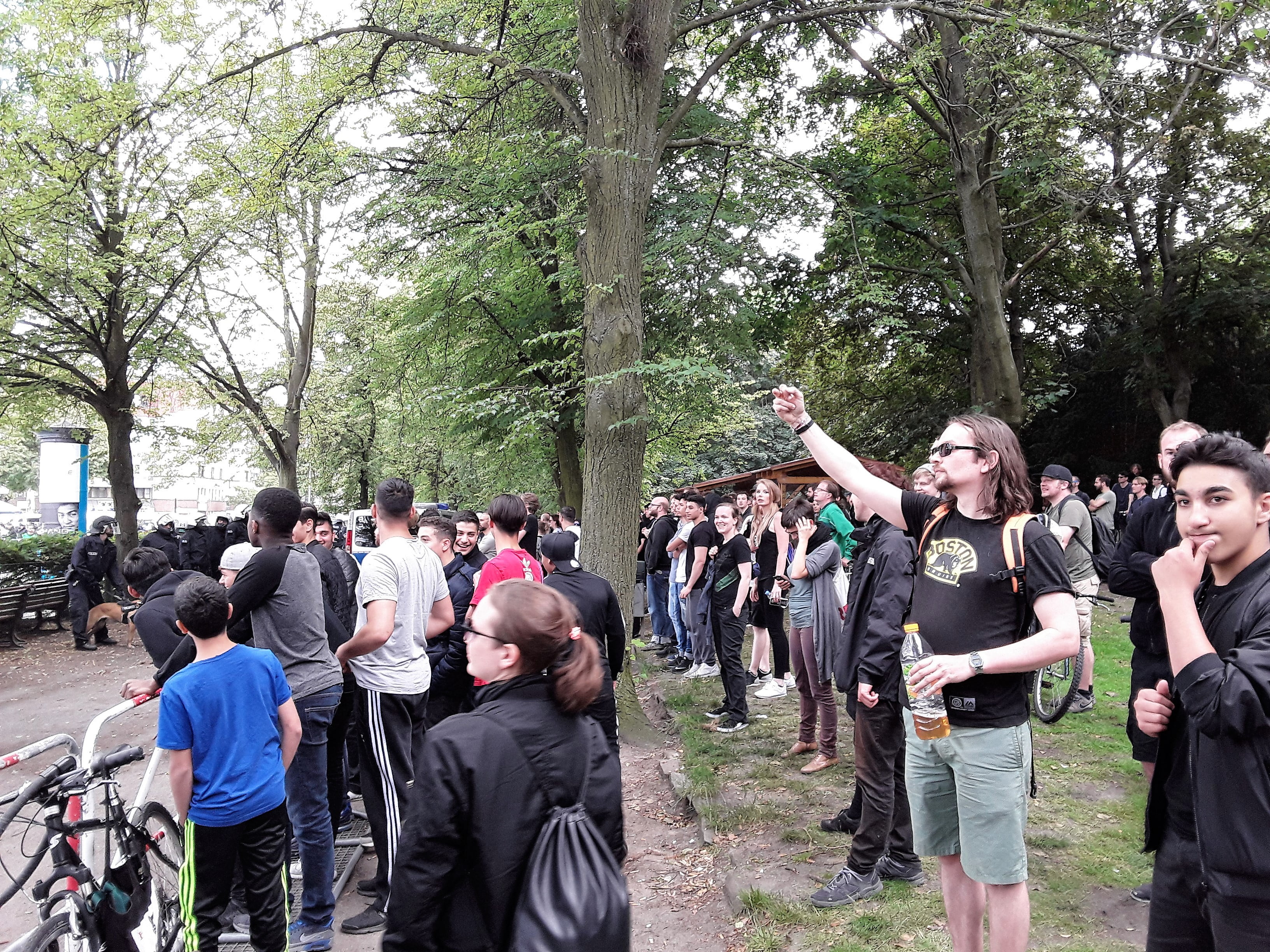 Zuerst fühlt man sich an ein Fußballspiel erinnert.Den skandierenden Antifas antwortet ein IB Chor mit „Heimatliebe ist kein Verbrechen“ und auf einmal mit einem textsicher vorgetragenen „Die Gedanken sind frei“. Aber die Lage droht, auch angesichts der geringen Polizeikräfte, die zudem ortsfremd sind, zu eskalieren.