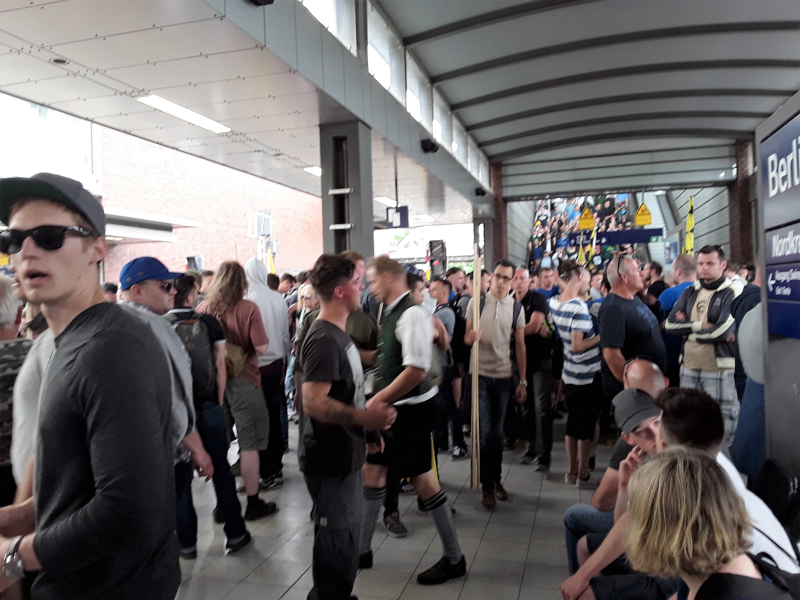 Ohne jede Anweisung bildet sich spontan eine Abwehrreihe. Die Abwehrreihe provoziert nicht, hält deutlichen Abstand zur trennenden Polizeikette auf ihrer Hälfte des Bahnsteigs. Die Gesichter sind konzentriert, man erkennt die innerliche Bereitschaft sich zu wehren, Angst ist in keiner Sekunde zu spüren, kein Laut kommt über die Lippen. Nervenzerfetzende Minuten.