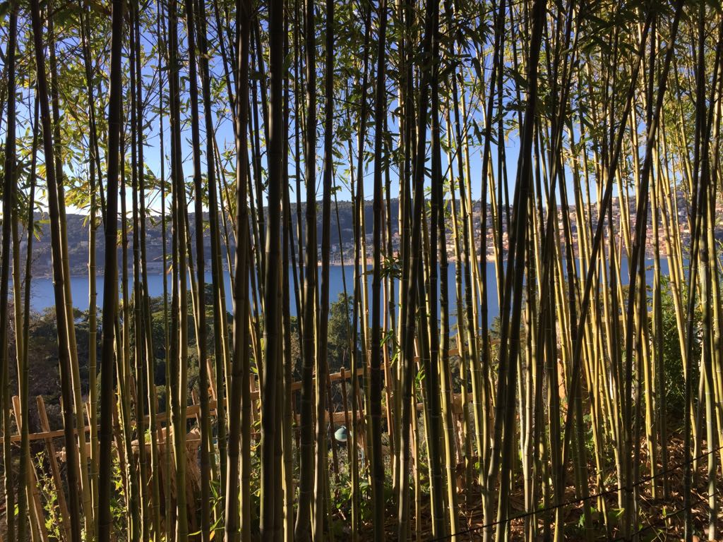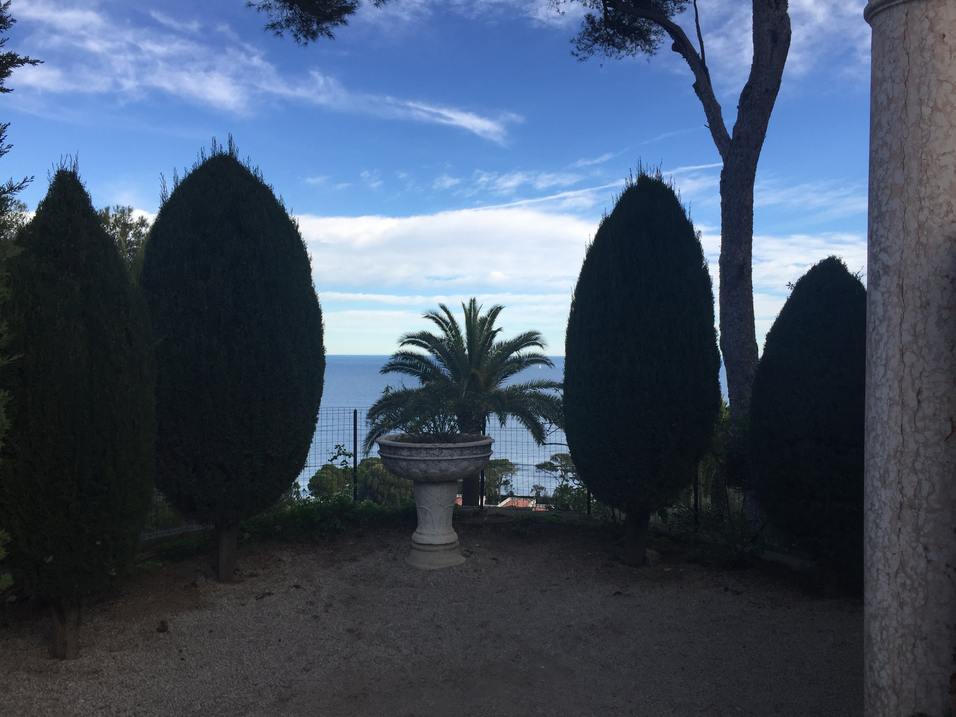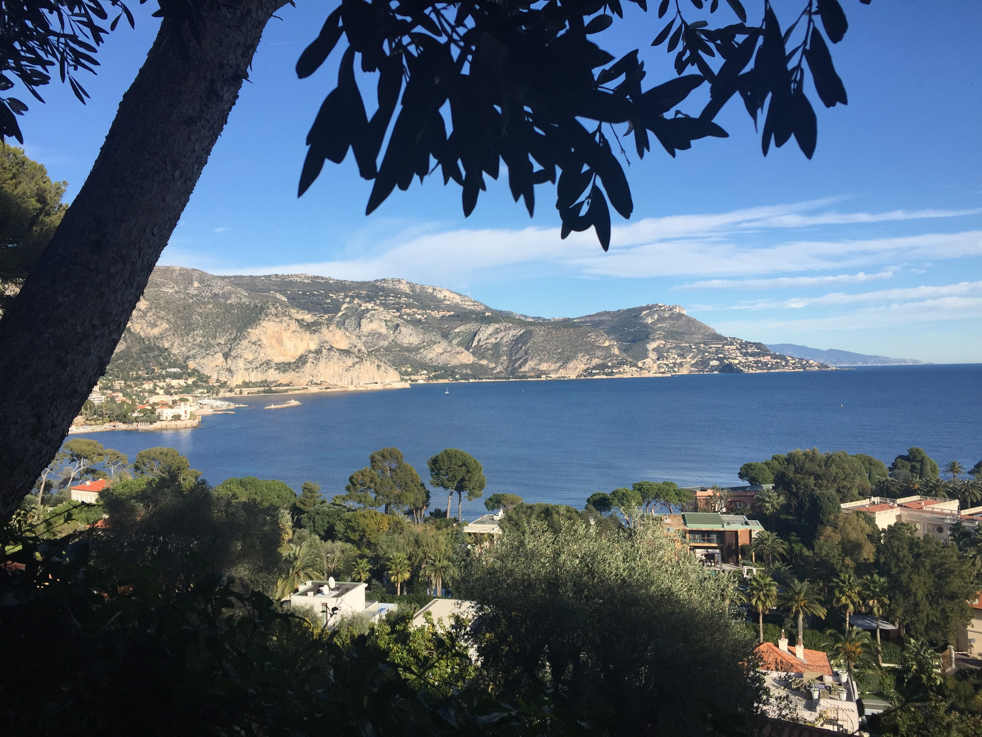 Dahinter – durch die mediterrane Botanik hindurch – das tiefblaue Meer. An klaren Tagen kann man über die Bucht von Nizza hinweg bis Antibes sehen.