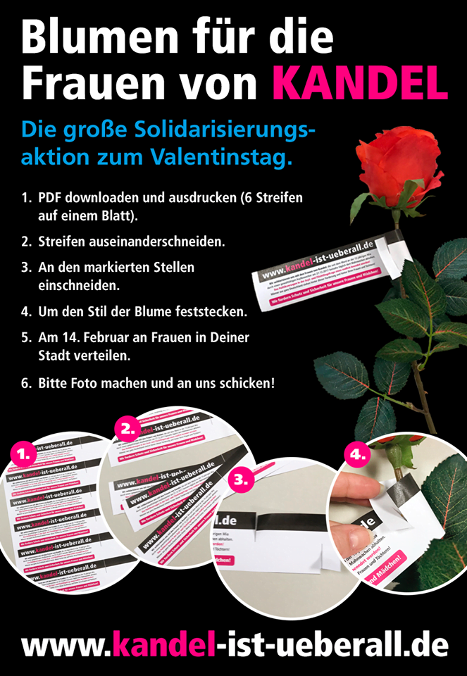 „Am 14. Februar ist Valentinstag. Wir haben für euch Männer etwas vorbereitet. Verschenkt Rosen! An eure Frauen, Kolleginnen, Mitarbeiterinnen usw. usw. – oder auch einfach so auf der Straße an Passantinnen.