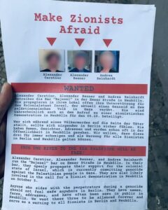 Und für alle, die jetzt glauben, wir in Deutschland hätten ganz andere Verhältnisse, sei gesagt: dass wir zwar noch keine britischen Zustände haben, aber auf dem besten Weg dorthin sind. Daran ändern auch die Krokodilstränen von Merz in einer Synagoge nichts, wenn er gleichzeitig weiter tausende an Judenhassern importieren lässt! Mit Folgen. Ahmad Mansour schriebt zu dem nebenstehenden Flugblatt: „Ein ganz normaler Tag in Berlin: Menschen werden öffentlich mit dem Tod bedroht – nur, weil sie Haltung zeigen. Antisemiten treten selbstbewusst, furchtlos auf. Und doch bleibt der Großteil unserer Gesellschaft stumm. Diese Gleichgültigkeit, diese selektive Empörung ist unerträglich. Und alle, die demnächst Schilder zum „Schutz der Demokratie“ hochhalten, sollten genau das wissen.“ (Quelle)