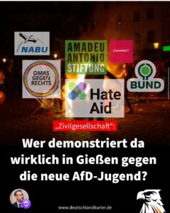 Auch wenn nun die Saat aufgeht, die Brandmauer-Politiker und ihre gleichgeschalteten Medien und NGOs (siehe Foto des „Deutschlandkuriers“)- angeblich im Dienste der Demokratie – ausgesät haben, kann man nicht umhin festzustellen: Der angekündigte Protest verhält sich wie eine totalitäre „Parallelmacht“. Er ersetzt nicht nur politische Auseinandersetzung, sondern greift deren Grundlagen und damit die Demokratie an — mit der Macht der Straße statt mit Argumenten. Besonders bedenklich, dass dieser Angriff über die NGO-Finanzierung noch mit unseren Steuergeldern indirekt finanziert wird, durch die angebliche „Demokratie-Abbgabe“ („GEZ“) an den Staatsfunk über Jahre hin provoziert wurde.