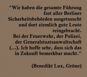 „Der Verfassungsschutz hatte Hinweise, dass linke Aktivisten einen weiteren Angriff auf die Energieversorgung der Stadt ausführen wollten. Das sagen Leute, denen manchmal etwas gesteckt wird von Verfassungsschützern, die selbst unsicher sind, ob ihre Warnungen von denen da oben überhaupt wahrgenommen werden. Der Verfassungsschutz hat natürlich Kontakte in die linke Szene. Die ist ja groß genug in dieser Stadt mit ihren Tentakeln in linke und grüne Politik hinein.