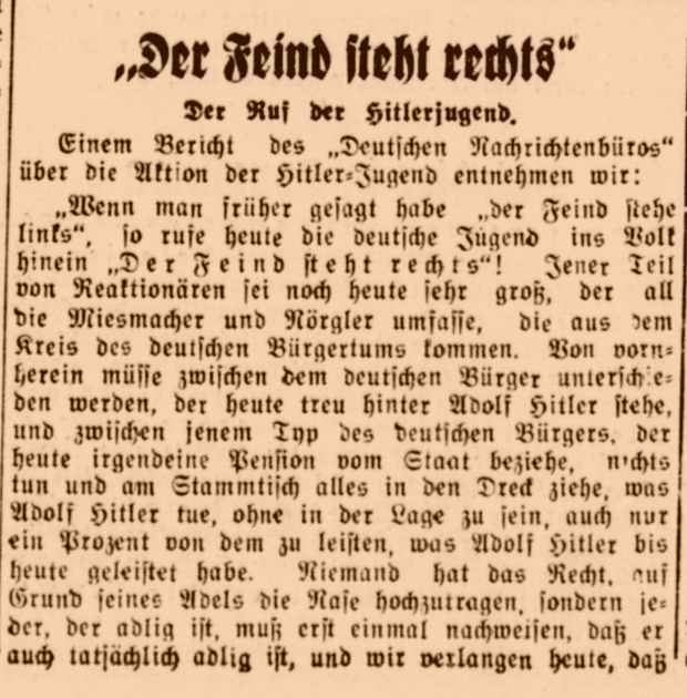 Noch erstaunlich ist nun, dass auch die Nationalsozialisten damals einen Kampf gegen „rechts“ führten. Auch diese – gezielt zum Hass gegen Teile der Bevölkerung aufstachelnde Hetzparole – haben also die gefühlten Linken von heute von den Nazis übernommen.