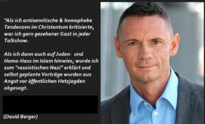 „Der Islam ist eine Religion des Friedens, des fröhlichen Miteinanders, gleicher Rechte für Männlein und Weiblein, gesunder Lebensführung und höchster Toleranz. Zudem gehört er zu Deutschland wie Schiller, Goethe oder Bismarck. Das Christentum hingegen ist ein im Sterben befindlicher Hort pädokrimineller Geisteskranker mit einem leichten Hang zu Ablasshandel, Hexenverbrennung und Kreuzzügen.“