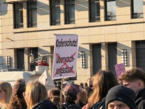 Dafür hatte man für traumatisierte Demoteilnehmer und andere Psychos einen eigenen Bereich mit psychischen Betreuern eingerichtet. Die Redner ließen wissen, dass sie denken, dass die Welt bald untergeht, wenn das so weitergeht, die ganze Welt sei voll von Männern, die alle Täter und „Wichser“ seien. Das System sei „scheiße“. Dagegen gäbe es in Syrien und Kurdistan eine tolle Frauenbewegung. Dass die Klarnamenpflicht beschworen wird, versteht sich von selbst …