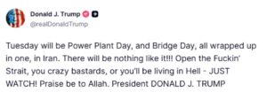 Am Dienstag – so Trump – werde er sensible zivile Infrastruktur des Islam (Kraftwerke und Brücken) so lange zerstören lassen, bis die Straße von Hormus freigegeben sei. Um dann ganz obszön fortzufahren: „Open the Fuckin’ Strait, you crazy bastards, or you’ll be living in Hell – JUST WATCH! Praise be to Allah.“