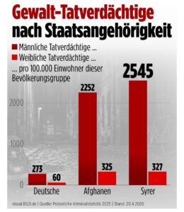 Was verschwiegen wird: Ursache für den enormen Anstieg an schweren Sexualdelikten sind nicht Männer generell, sondern eine bestimmte Männergruppe. Der Anteil nichtdeutscher Tatverdächtiger in der aktuellen Kriminalstatistik ist erneut angestiegen und lag insgesamt bei 35,5 Prozent, dabei wurden ausländerrechtliche Verstöße hier noch gar nicht berücksichtigt. Besonders zeigt sich der Anstieg bei Mord, Totschlag und Tötung auf Verlangen (plus 6,5 Prozent) sowie Vergewaltigung, sexueller Nötigung und sexueller Übergriffe im besonders schweren Fall auch mit Todesfolge (plus 8,5 Prozent). Die Zahl der Kinder, die durch Gewaltkriminalität auffielen, stieg zwar um 3,3 Prozent auf rund 14.200 Tatverdächtige an. Der Anstieg fiel jedoch weniger stark als im Vorjahr aus (plus 11,3 Prozent). (Quelle)